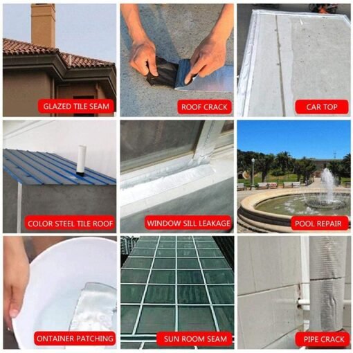 Length: 1.5Meter Width: 10cm Thickness: 0.8/1/1.5mm(Optional) Material: Aluminum Foil, Butyl Rubber DIY Supplies: Paint & Decorating Application: This sealant tape is widely used in roofing of the building, surface crack, RV repair, window, boat Sealing, glass and roof patching